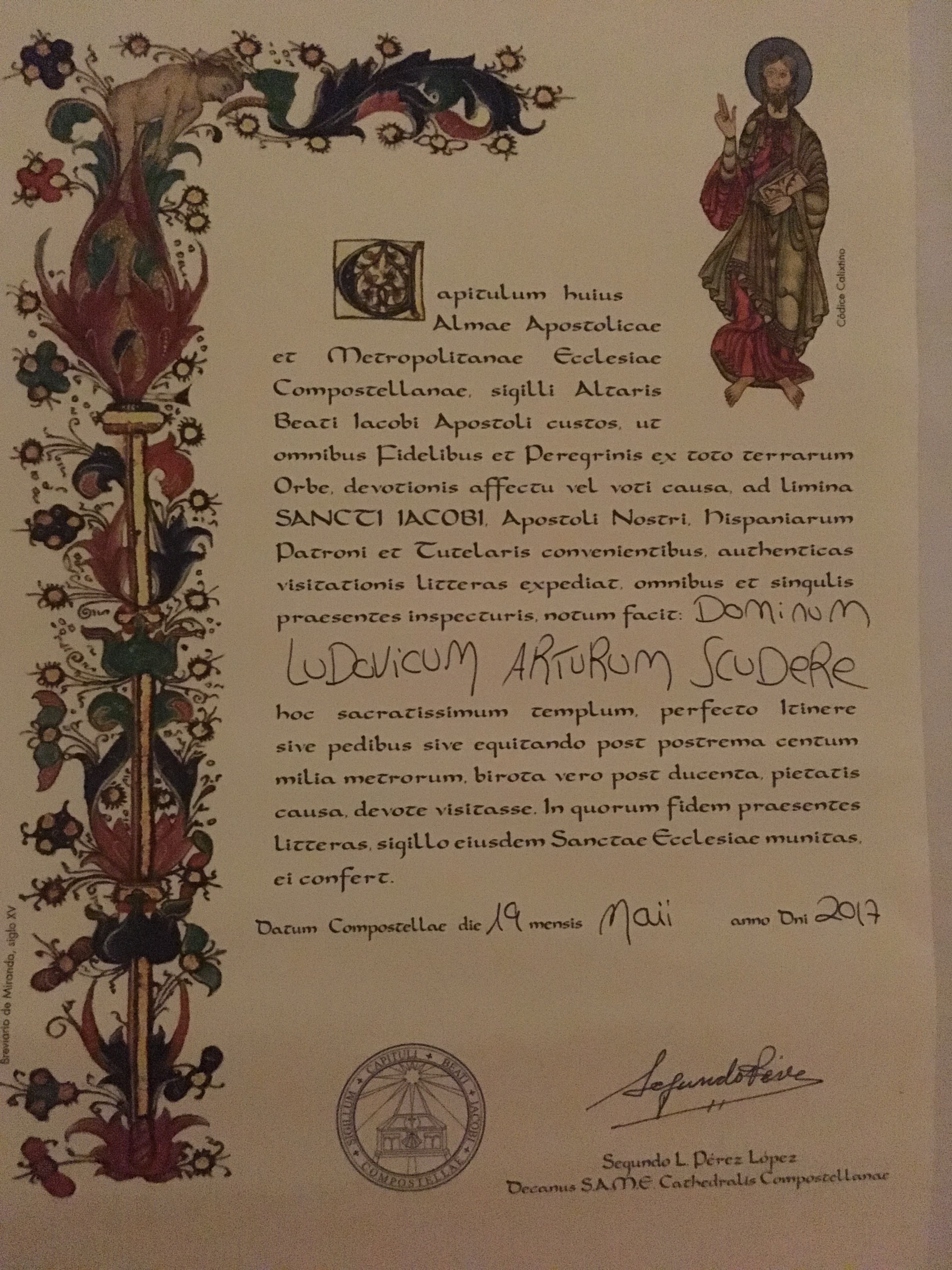By the way, for those who might be interested. the above is my Compestela, being written in Latin designating the completion of a religious pilgrimage. After walking 14 miles the last day I stood in line nearly an hour with other pilgrims wait to have my pilgrim’s passport validated. The office had 15 lanes going! A lot of pilgrims passed through that day.