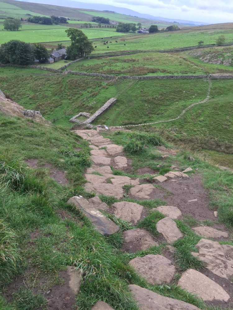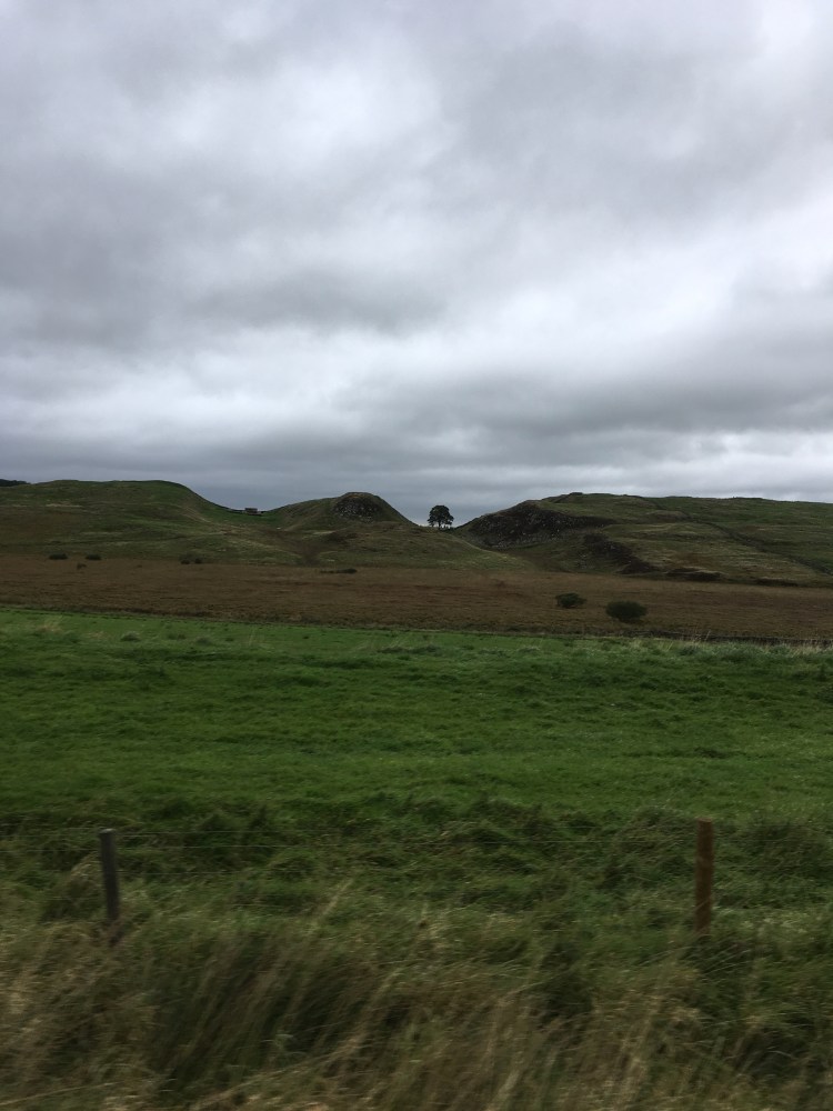 We first went back to the end of our trek from the day before to hike to the Sycamore Gap. The tree is often the symbol for Hadrian’s Wall. I climbed the first crag, roughly a sixty degree ascent, my quads screamed with every step as I pushed myself up. I had hit my wall. My greater concern was the descent with my thigh muscles at near failure. My thought was to complete the ascent walk over to the edge of the crevasse and take a picture of the damn tree but when we got to the top we realized that the gap was a hike of roughly another 1/4 mile over the crag plus a descent into the gap. I raised the white flag and told the crew to go on without me I’d meet them on the return. It was then that I recorded this: