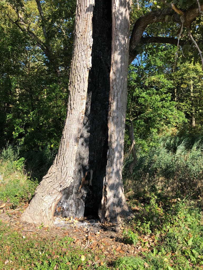 Hiking like this, without significant elevation, allows for a lot of conversation and Rich and I, neither ever much at a loss for words, swapped stories in an easy manner. Along the way we found a tree with an impressive scar from a lightening strike as shown below.