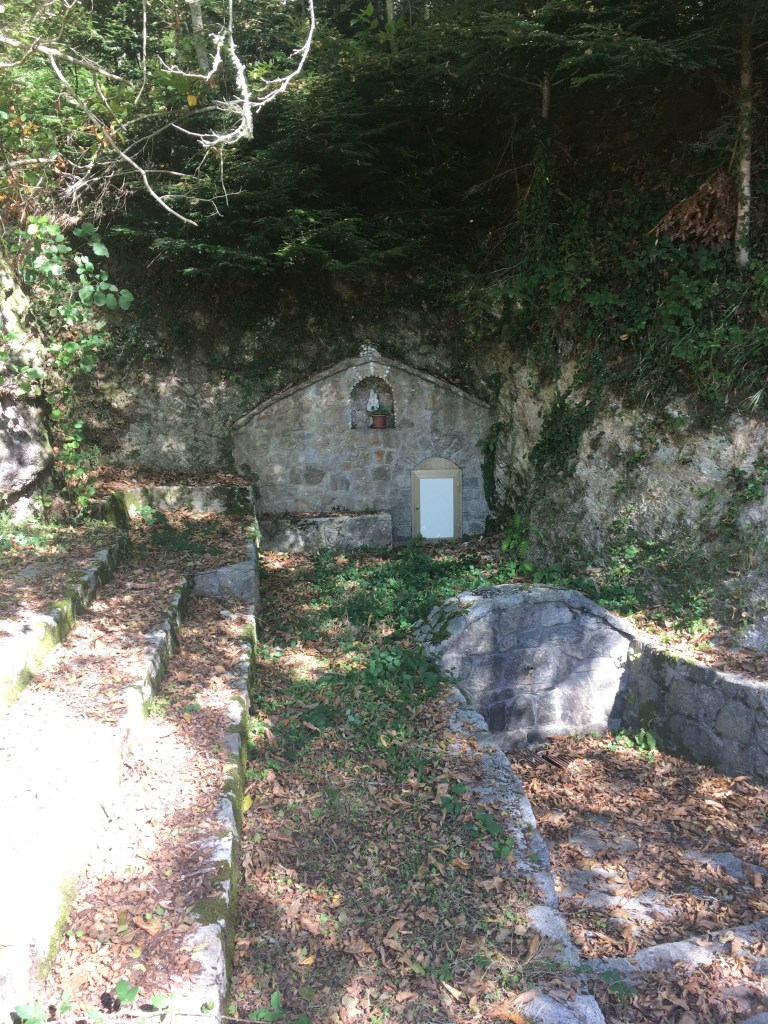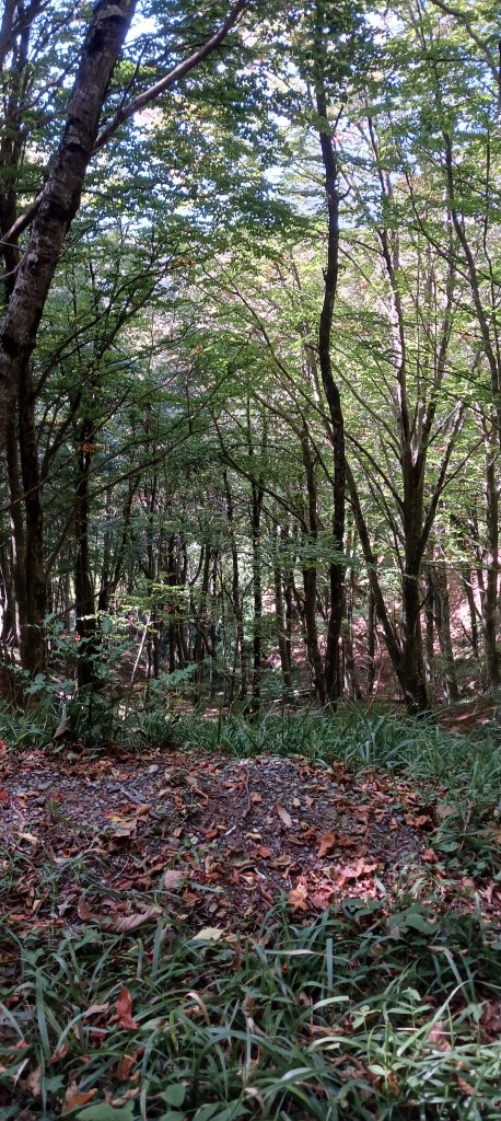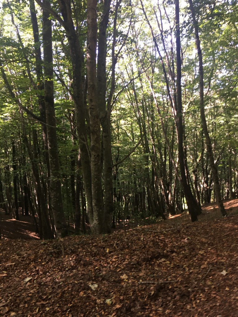 Birch Forest -SJSWill and I on the trail – SJSTree face – WLSRelaxing at picnic area – WLSLooking back towards Monterosso – WLSOld bathing area Lago Acero – SJSDown hill to San Vito – SJSStone wall – WLSSan Vito first look – WLSNear San Vito – SJSBertram river San Vito – SJS