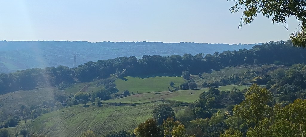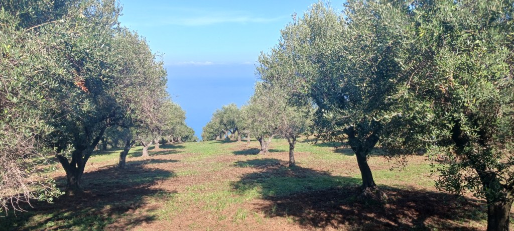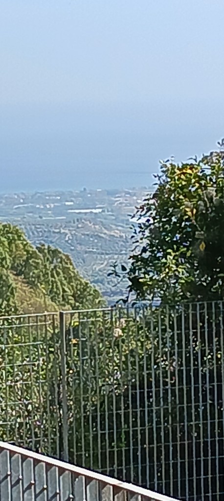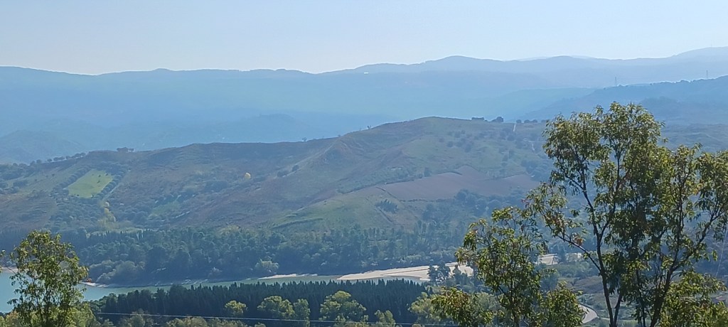 Starting up Pizzo ridge – SJSNearing the top of the Pizzo ridge – SJSAt top of Pizzo Ridge. Speck in water upper center right is the oil tanker from earlier photo – SJSPizzo Ridge no zoom – WLSRidge view north – WLSOlive Grove ridge to the sea – WLSView to north from Ridge – WLSCalabrian farmlands – SJSPossible fort ruins – WLSLago AngitolaLandscape looking toward Monterosso – WLS