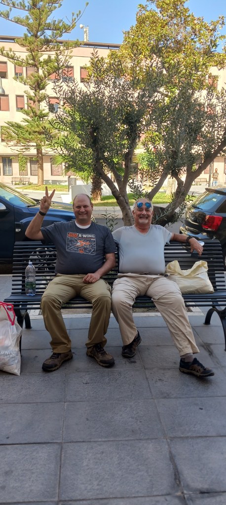 We must have all been getting a little burned out on picture taking at this point because none of us have any more pictures of downtown Soverato, which is too bad it is a cute pedestrian friendly downtown. We did go back to the little bar we drug ourselves into the night before at the end of our hike to enjoy an evening snack. The young lady who waited on us the night before came up smiling and asked “Tutte bene?” meaning “All better?” To which I replied “Si molto tutte bene” or “yes, very much better” and laughed as I ordered a round of drinks for the table. Next dispatch San Giovanni in Fiore, the home of my great grandparents where we meet my cousin(?) the Mayor. 🙂