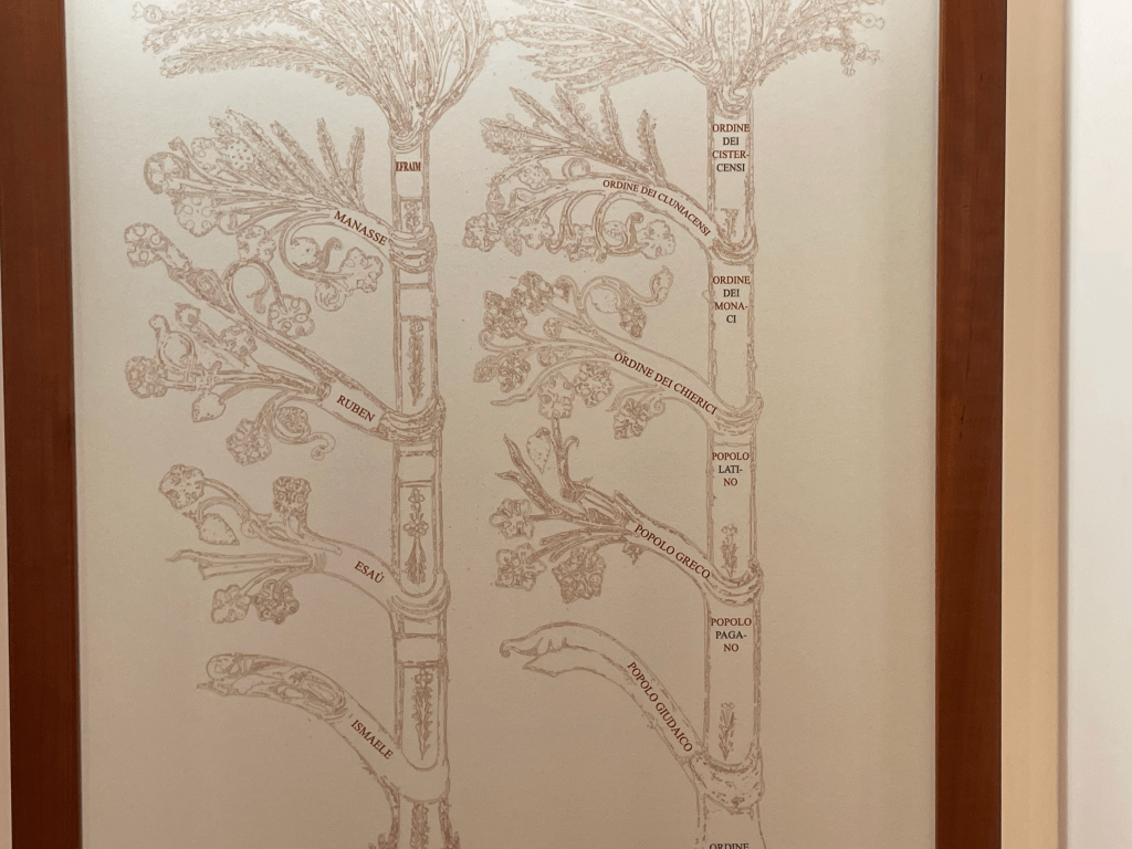 Abbot Gioacchino was a prodigious producer of theological precepts writing three great books : Exposition on the Apocalypse, Enchiridion on the Apocalypse, On the Articles of Faith to Brother John: Confession of Faith as well as using illustrations to illuminate his theological concepts. I will not attempt to go into depth on explaining much about the Abbot as 1.) I would not do it the justice and scholarly insight that it deserves and 2.) If I did attempt 1., I would shortly have an audience of readers that were either bored , confused, or amused as I wrapped myself around the axle trying to explain things of which I truly have no understanding beyond the fact that they exist. So, I am merely going to show you photos of his work, telling you what they are with little to no explanations. If you desire to get a bit more in depth, I would suggest that one start at the following site: https://alchetron.com/Joachim-of-Fiore . Sindaco Succurro gave me a book explaining the illustrations of the Abbot which is written entirely in Italian. So, I have a reason to further my studies of the language :-). I am presenting the drawings in the order they are displayed in the exhibit. Having said that, here goes.