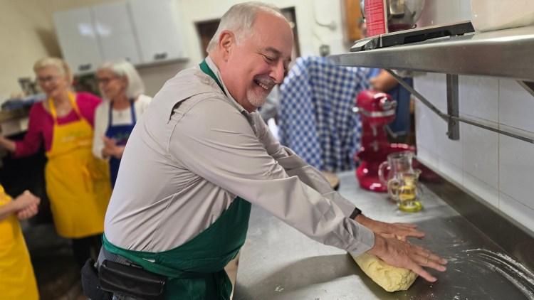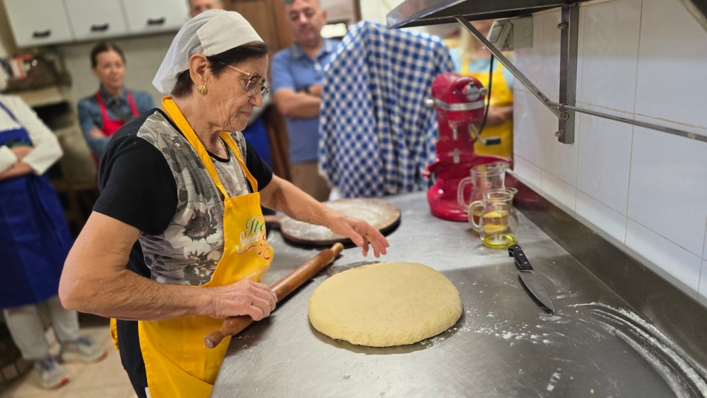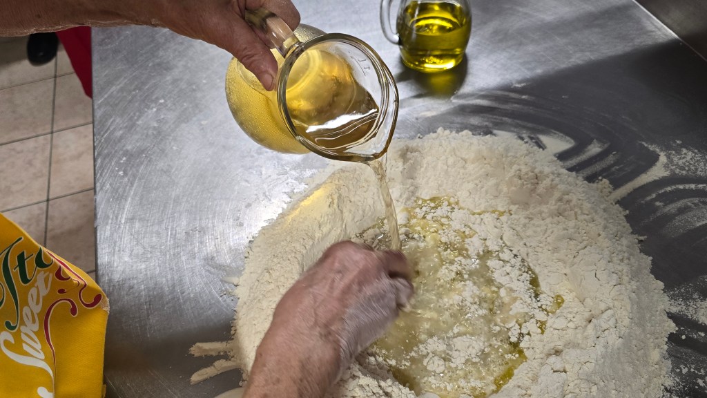 Now, I’m great at hanging wall paper but I suck at house painting. In the area of culinary skills I consider myself to be an above average cook but I suck as a baker. However, Zia Miranda was a baker after my own heart as when one of the group asked for measurements of the oil and wine with the flour Zia Miranda replied without missing a stroke “Quando Γ¨ abbastanza” (when it’s enough). A cook after my own heart as I rarely measure things precisely, my hand is my measuring spoon set though I will admit to using measuring cups when necessary though rarely do I level them off. Thus, given that baking is very much a chemical reaction in part driven by fairly precise ratios of ingredients to one another, I am a much better cook than I am a baker. But I did get a chance to get my hands a little messy after the fact.