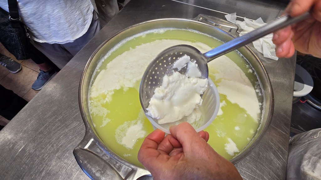 What I found interesting in this process is that once the solids are separated from the whey to begin the cheese making process as shown above, the whey is heated again which releases more solids. This “recooked” whey….(“ricotta” in Italian) is the source for what we in the States call ricotta cheese. However, ricotta in Italy is not considered a cheese. It is just ricotta. Who’d have thunk LOL.
